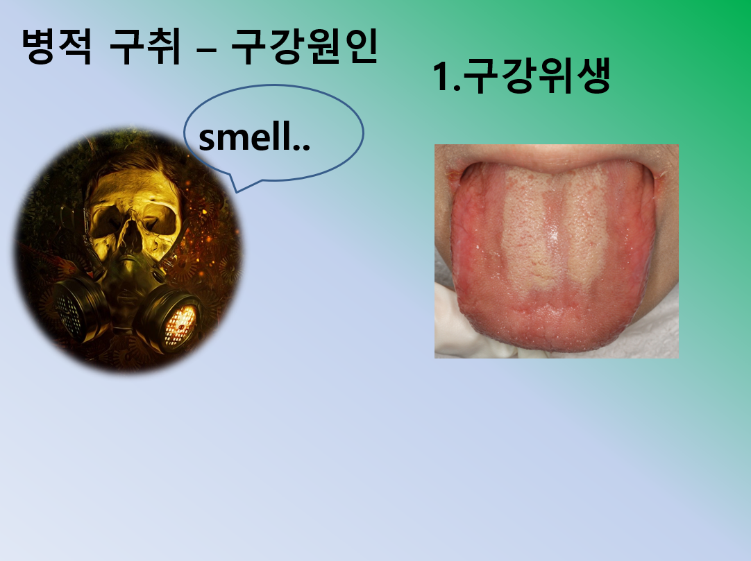 입냄새가 난다고 다 질환인 것은 아니다.기상 직후나 이야기를 많이 한 뒤 긴장했을 때, 그리고 생리나 임신 중에 나는 입냄새는 정상이라는 기상 직후, 긴장하거나 말을 많이 했을 때는 입안이 건조해진다. 이렇게 입안이 건조해지면 입안 점막이 건조해지고 부패해 냄새가 난다. 생리나 임신 중에는 호르몬 변화를 일으켜 냄새가 날 수도 있는 병적인 구취, 구취의 경우 원인의 90%는 입 안에 있으며 혀를 도는 동안 음식 찌꺼기가 끼며 거기서 혐기성 세균이 번식해 냄새를 유발시키는 설태가 가장 흔한 원인으로 알려진 충치, 치주염, 치은염과 같은 염증성 치과 질환도 주요 원인이 된다. 치과 보철물, 교정기나 틀니도 원인이 될 수 있는 이러한 입안의 원인 이외에도 구취를 유발하는 질환으로는 축농증, 편도선염 및 편도결석, 역류성 식도염, 당뇨, 신부전 등이 있는 축농증은 콧속에 있는 고름 자체가 원인이며 축농증으로 인한 갈증 즉 콧물이 코 뒤로 와서 구취를 유발하기도 한다.편도선염 및 편도결석의 경우 편도 주위 세균 번식으로 인해 구취를 유발하는 역류성 식도염의 경우 위산 및 위 내용물이 역류하여 냄새를 유발하는데 트림을 하면 냄새가 나는데 비슷한 이유라고 보면 된다.