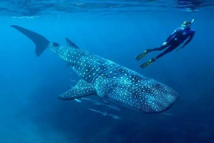 고래 상어는 작은 보트에 뿌려진 음식을 따라 가서 배가오고 있는지 확인하고 가까이 오면 다이빙 할 수 있습니다. 너무 커서 너무 온화하여 사람들에게 해를 끼치 지 않습니다.