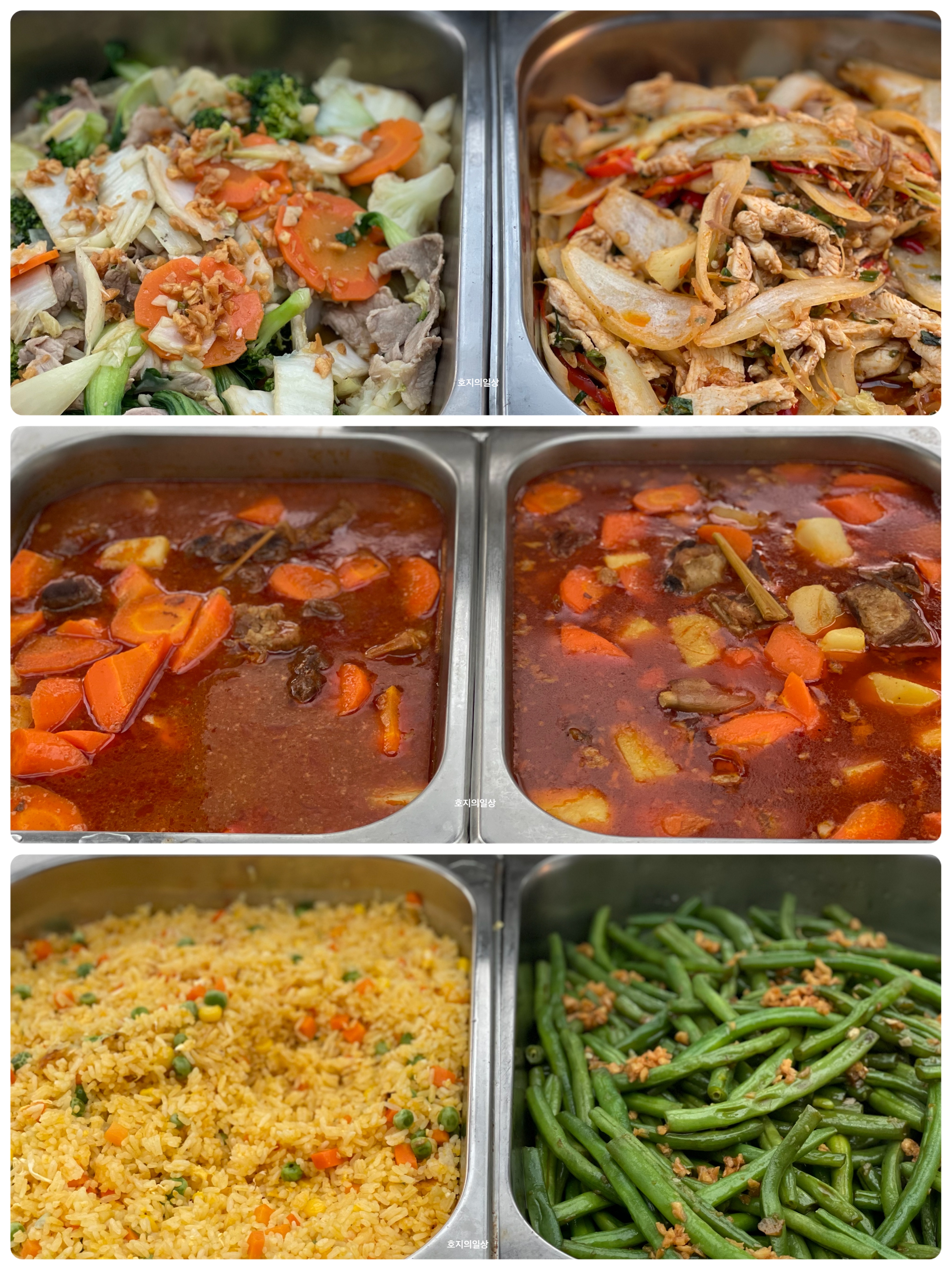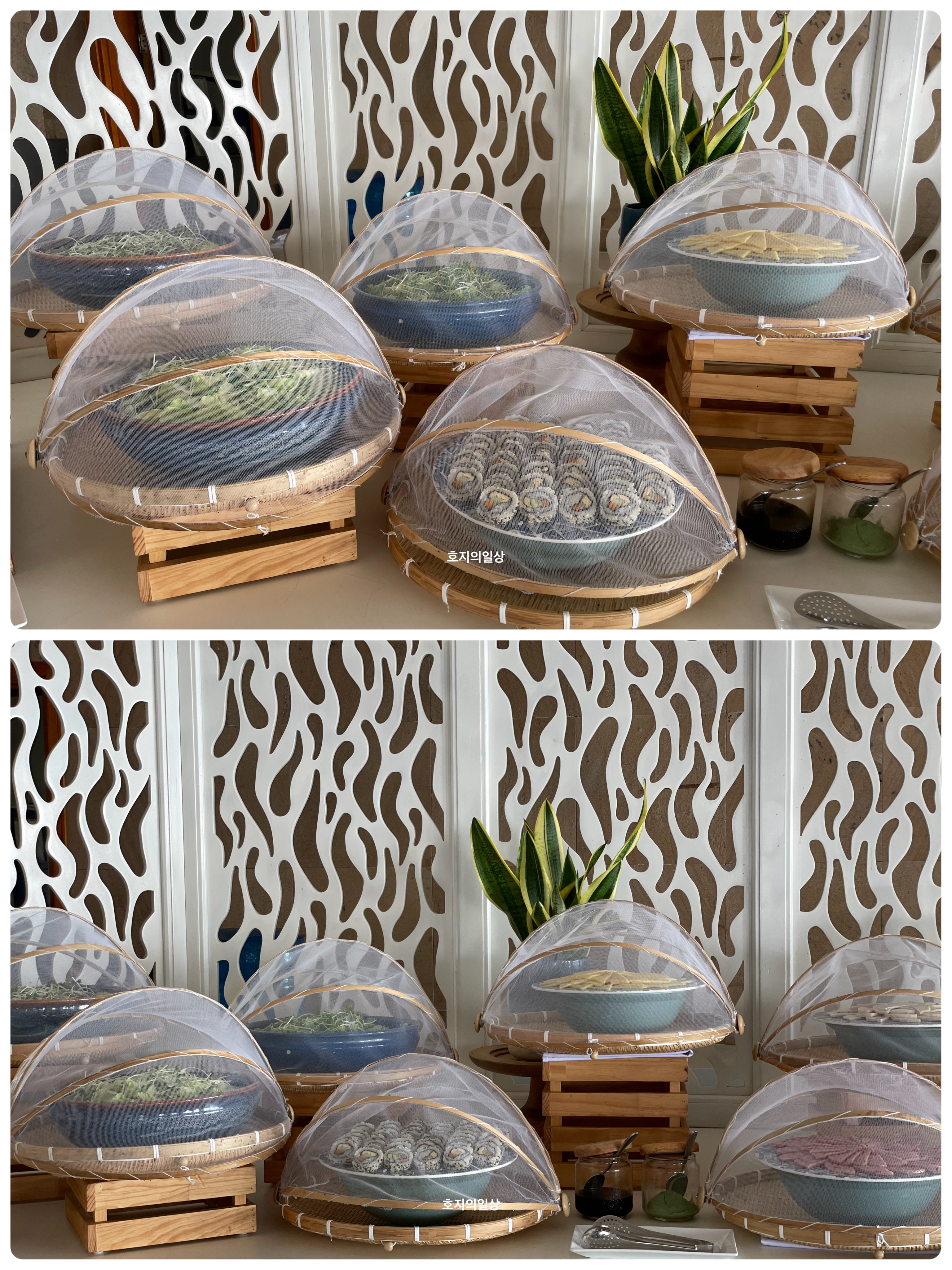 아침 식사 공간은 샐러드 바와 즉석 요리 코너로 구성되어 있습니다.
